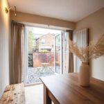 The ground floor offers a fantastic open-plan living space featuring a bespoke hand-painted ply kitchen, a built-in dining area with wooden panelling and brass wall lights, and French solid oak flooring throughout. Patio doors lead out to a rear enclosed courtyard garden, perfect for relaxing or socialising.