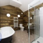 The open-plan kitchen-diner provides a social hub, while the epic bathroom features a pink cast iron bathtub, concrete sink, and reclaimed timber cladding – a unique and stylish space.